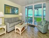 Carefree décor brings the beach right inside with the soft blues. This townhouse has spacious living/dining area with fully equipped corridor kitchen on first level, and two bedrooms on second level.